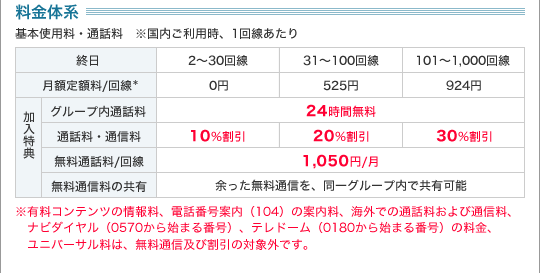 | ※1 | 各種特番サービス(1406/1416/*や♯で始まる番号)への通話は、時間帯に関係なく21円/30秒がかかります。 |